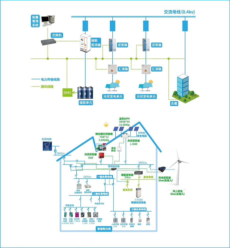 用戶側(cè)儲(chǔ)能/光儲(chǔ)充微網(wǎng)系統(tǒng),通過靈活接線,能夠?qū)?chǔ)能、充電樁、光伏、等單元與微電網(wǎng)內(nèi)各負(fù)荷類型進(jìn)行有機(jī)組合,構(gòu)建各類綜合能源服務(wù)角色,模擬各種區(qū)域能源業(yè)務(wù)場(chǎng)景,實(shí)現(xiàn)終端用戶在能源業(yè)務(wù)場(chǎng)景中的緊密互動(dòng)。通過智慧供能控制平臺(tái),實(shí)現(xiàn)儲(chǔ)能削峰填谷功能與光伏發(fā)電結(jié)合,進(jìn)行峰谷套利,提升可再生能源消納水平。通過電動(dòng)汽車充電樁的應(yīng)用以及可控負(fù)荷的靈活調(diào)度,提升終端電氣化利用效率,提升用能水平,降低用能成本??尚纬捎刑厣?、有活力的、大眾參與的綜合能源服務(wù)創(chuàng)新運(yùn)營(yíng)模式,催生具有盈利空間的新興能源消費(fèi)生態(tài)體系,引領(lǐng)綜合能源服務(wù)發(fā)展方向。